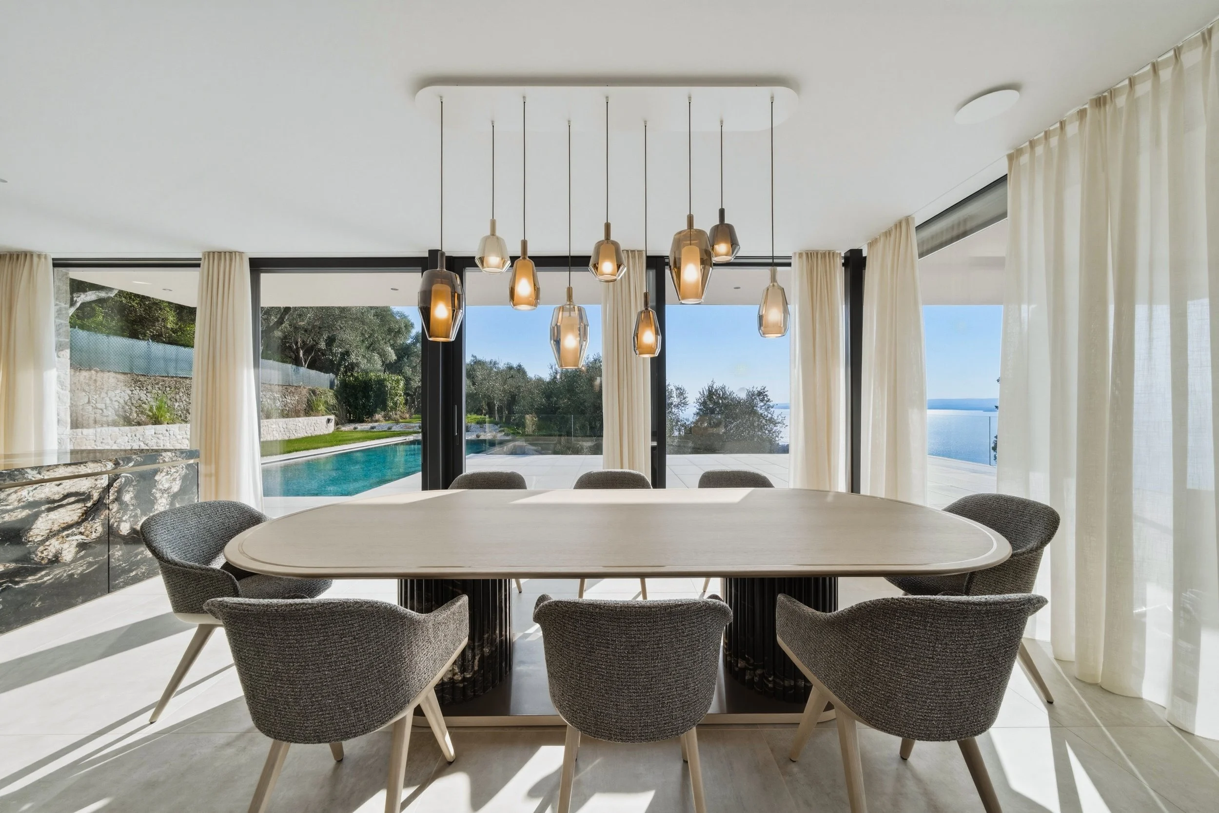 Design Interno & Bagni: La particolarità di questa villa e’ la "Black Metal Edition". Tutta la rubinetteria (brand Gessi, serie 316 e Intreccio) è realizzata nella sofisticata finitura Black Metal Brushed. Il contrasto tra il metallo nero spazzolato e i materiali naturali crea un'atmosfera di lusso metropolitano.